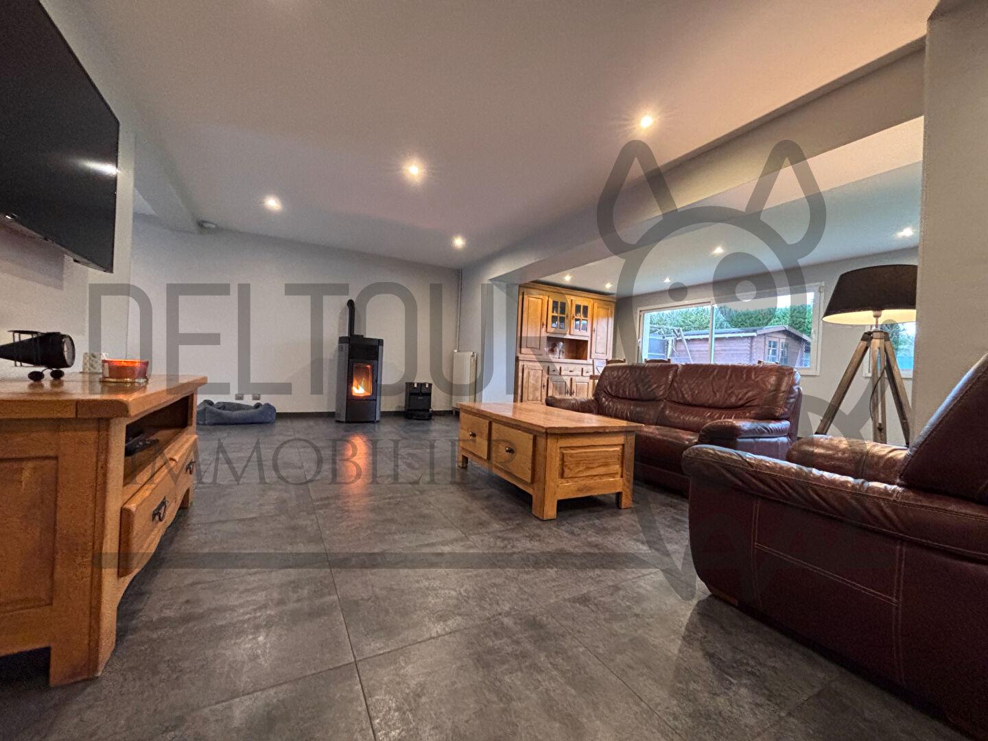 Au rez-de-chaussée, vous serez séduit par un vaste espace de réception de 116 m² comprenant un hall d'entrée, un salon chaleureux équipé d'un poêle à granulés, une salle à manger conviviale et une cuisine aménagée et équipée.
