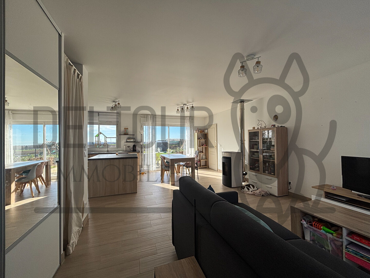 - entrée avec placards, pièce de vie avec poêle à granulés, salle à manger, cuisine aménagée et équipée, cellier, dégagement, 3 chambres équipées de placards, salle d'eau, WC séparé.