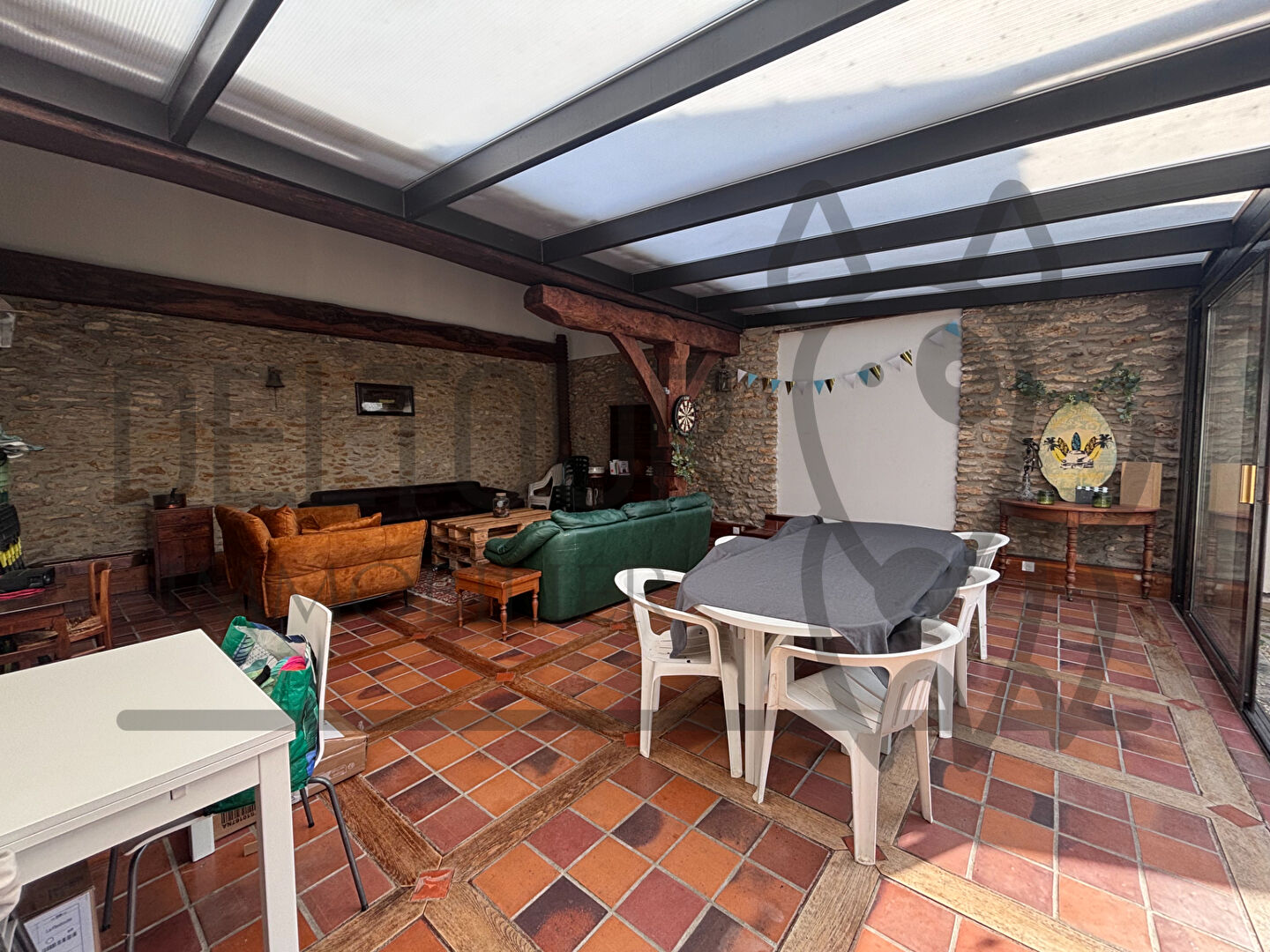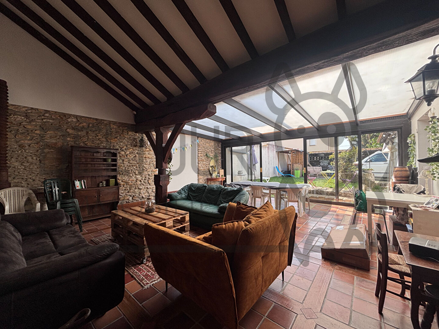 Côté vie, un vaste espace séjour de plus de 125 m² comprenant salon avec cheminée insert, salle à manger et véranda lumineuse ouvrant sur le jardin.
